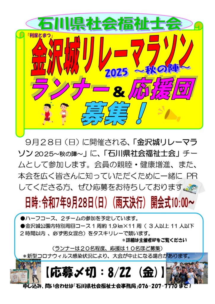 2025年8月6日 / 最終更新日 : 2025年8月6日 icsw お知らせ 金沢城リレーマラソン2025~秋の陣~ 毎年恒例 秋のリレーマラソンです 振るってご参加ください ランナー・応援団 募集中です posマラソン25秋ダウンロード