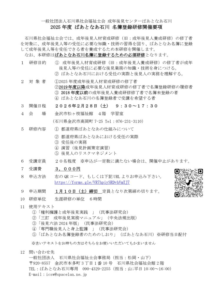 2025年12月19日 / 最終更新日 : 2025年12月18日 icsw お知らせ 2025年度 ぱあとなあ石川 名簿登録研修開催要項 2026年2月28日 金沢市松ヶ枝福祉館にて開催します 2025年度名簿登録研修開催要項ダウンロード